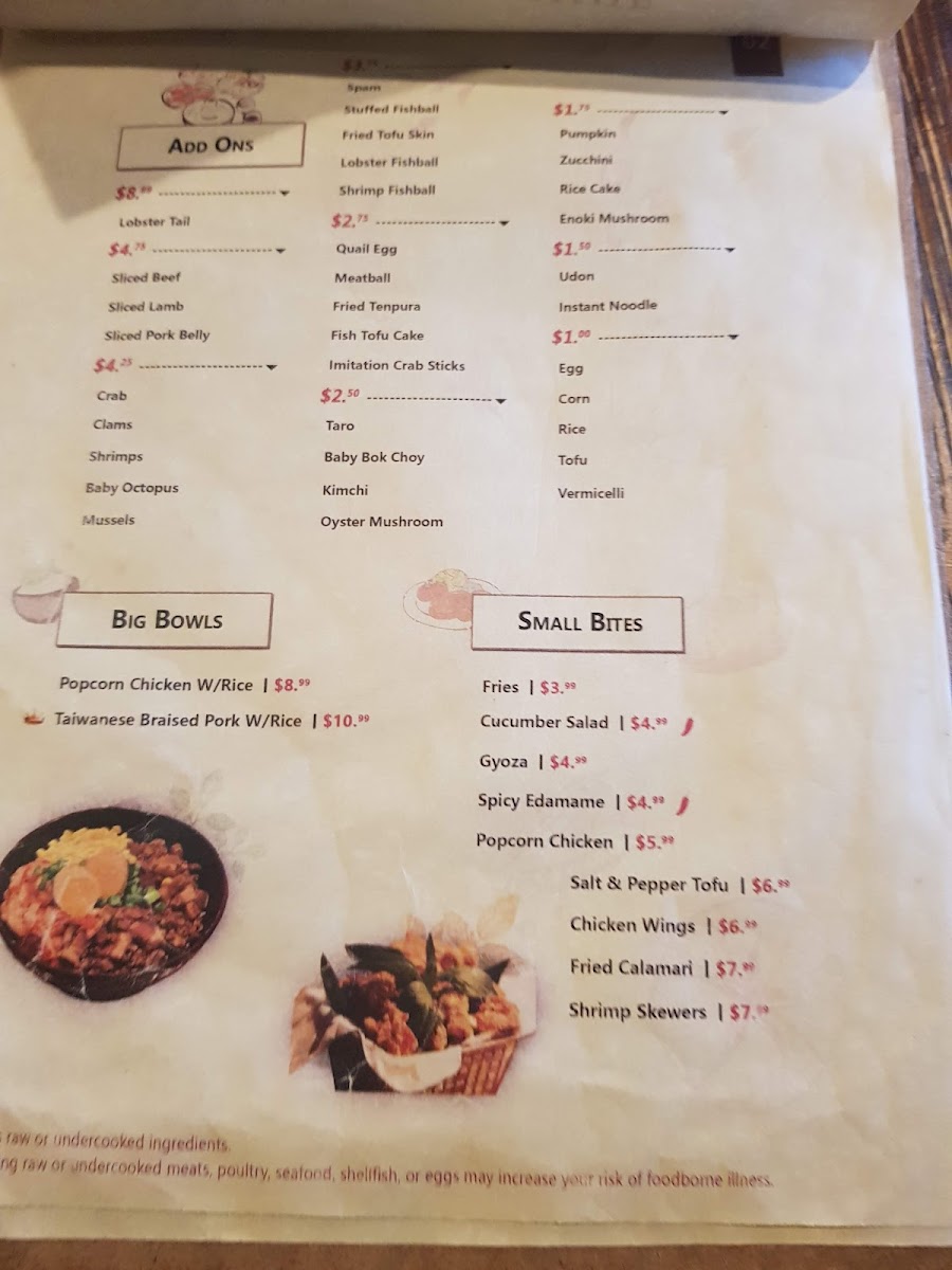 The restaurant's menu is a tantalizing mix of comforting rice bowls and mesmerizing hot pots. You can't miss the Popcorn Chicken Rice Bowl, priced at a mere $8.50, a dish that transports your taste buds to Taiwan with its perfectly seasoned and crispy chicken, beautifully paired with fluffy rice. For those craving deeper flavors, the Taiwanese Braised Pork Rice Bowl at $10.50 is a culinary embrace, featuring rich, savory pork that simply melts in your mouth.